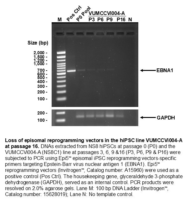 | Selection criteria for clones | The hiPSC colonies were identified by stem cell-like morphology, alkaline phosphatase (ALP) live stain and TRA-1-60 live stain. The undifferentiated, TRA-1-60-positive hiPSC colonies were picked and transferred onto hESC-Qualified Matrigel-coated culture dishes for expansion. The expanded hiPSC colonies were analyzed by fluorescent immunocytochemistry (ICC) of 4 pluripotent stem cell (PSC) markers (OCT4, SOX2, SSEA4, and TRA-1-60) to confirm their positive expression. VUMCCVi004-A OCT4+ cells: 97.5% +/- 1.9% (n = 5) SOX2+ cells: 96.2% +/- 1.5% (n = 6) SSEA4+ cells: 99.3% +/- 0.9% (n = 5) TRA-1-60+ cells: 99.7% +/- 0.2% (n = 6) |